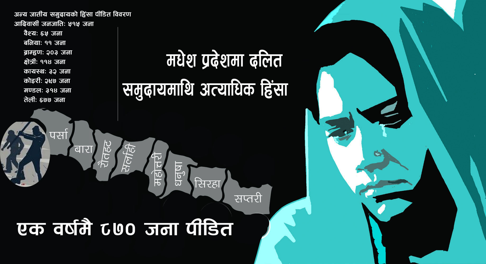 जनकपुरधाम, २१ जेठ। मधेश प्रदेशमा जातीय विभेद र सामाजिक असमानताको चपेटामा परेका दलित समुदायमाथि निरन्तर हिंसा भइरहेका छन्। औपचारिक सेवा केन्द्र (इन्सेक) द्वारा संकलित तथ्यांकअनुसार, सन् २०२४ को जनवरीदेखि डिसेम्बरसम्मको अवधिमा ८७० जना दलित हिंसाका घटनामा पीडित भएका छन्। तीमध्ये ३७२ जना राज्यपक्षबाट र ३६० जना गैरराज्यपक्षबाट पीडित भएका हुन्।