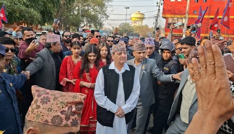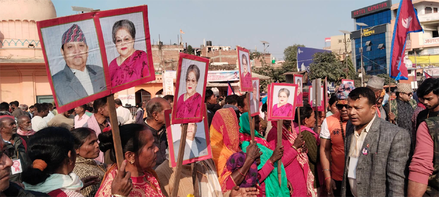 जनकपुरधाम, १२ माघ । पूर्व राजा ज्ञानेन्द्र वीर विक्रम शाहको जनकपुरधाम भ्रमणका क्रममा सोमबार उहाँका समर्थकहरूले ‘हिन्दु राष्टू कायम गर’ लगायतका नारा लगाउँदै प्रदर्शन गरेका छन् । धार्मिक स्थलहरूको दर्शनका लागि जनकपुरधाम आइपुगेका पूर्व राजा शाहको उपस्थितिलाई लक्षित गर्दै समर्थकहरूले राजसंस्थाको पुनःस्थापना र नेपाललाई हिन्दु राष्टू घोषणा गर्नुपर्ने माग अघि सारेका हुन् ।
